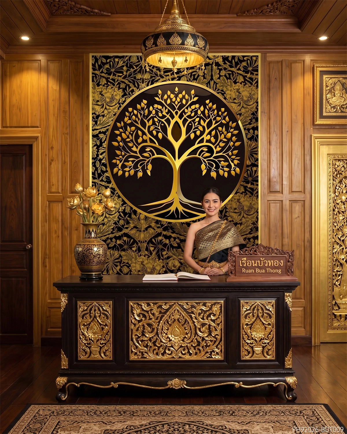 🔱 ศาสตร์แห่งสีสันและสัญลักษณ์มงคลถูกถ่ายทอดผ่านลายเส้นกนกที่พริ้วไหวแต่แฝงด้วยความทรงพลัง โดยมี “ต้นโพธิ์” เป็นศูนย์กลางสื่อถึงความร่มเย็นเป็นสุข สติปัญญา และความมั่นคงยั่งยืน สีทองอร่ามที่ใช้เป็นตัวแทนของความมั่งคั่งร่ำรวย ทอประกายล้อแสงไฟอย่างมีมิติ ตัดกับพื้นหลังสีดำสนิทลุ่มลึกที่ช่วยขับเน้นลวดลายให้ดูโดดเด่น สร้างบรรยากาศที่ดูแกรนด์และดูขลังในเวลาเดียวกัน 🌌✨ ไม่ว่าจะเป็นการตกแต่งในร้านอาหารไทยระดับ Fine Dining หรือ Lobby โรงแรมหรู ภาพพิมพ์นี้จะทำหน้าที่เป็นผนังประธานที่บอกเล่าเรื่องราวความประณีตได้อย่างทรงพลัง ช่วยเสริมบารมีและฮวงจุ้ยที่ดีให้กับสถานที่ของคุณอย่างสมบูรณ์แบบ 💰🔝🏮