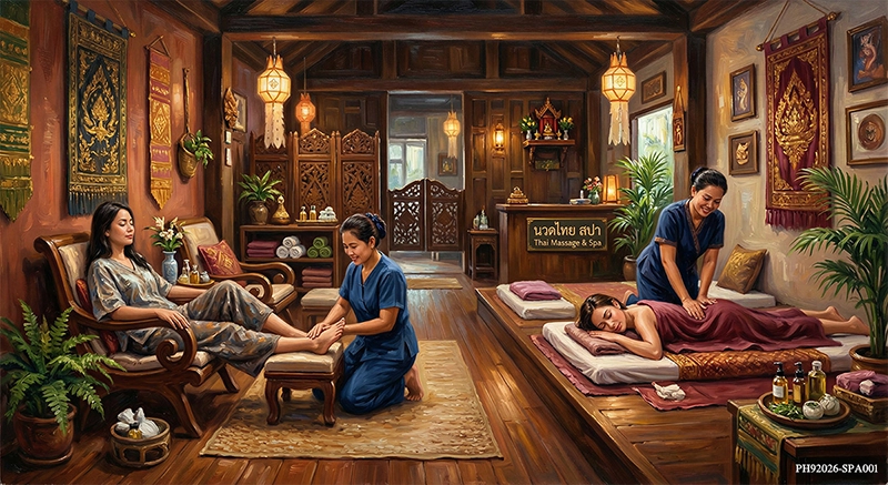 💡 สัมผัสความงามอันเลอค่าของวัฒนธรรมไทย ผ่านวอลเปเปอร์ภาพพิมพ์สไตล์ภาพวาดเสมือนจริงที่บรรจงถ่ายทอดบรรยากาศภายในร้านนวดและสปาได้อย่างครบถ้วน 💡